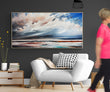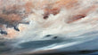The Gathering Quiet has a moody, cinematic quality, capturing that charged pause when nature holds its breath. It feels expansive and dramatic, almost like the moment before the weather turns. The sky dominates the scene, filled with rolling clouds that shift from soft peach and cream into deep greys and cool blues. There’s a strong sense of movement in the brushwork, as if the wind is gathering speed across the horizon.