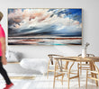 Below, the ocean and shoreline are painted in sweeping layers of charcoal, rust, white and hints of aqua. The colours create a striking contrast between the warmth of the land and the cold tension in the sky.