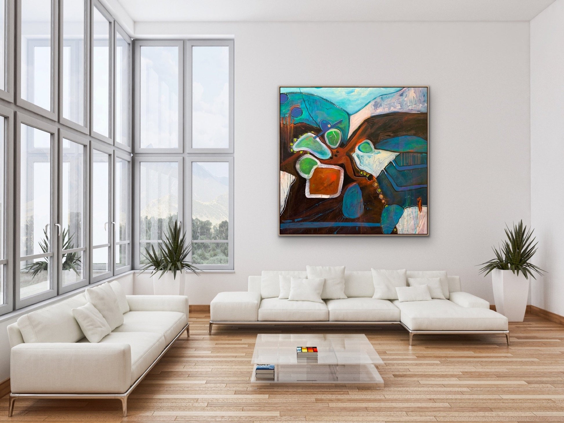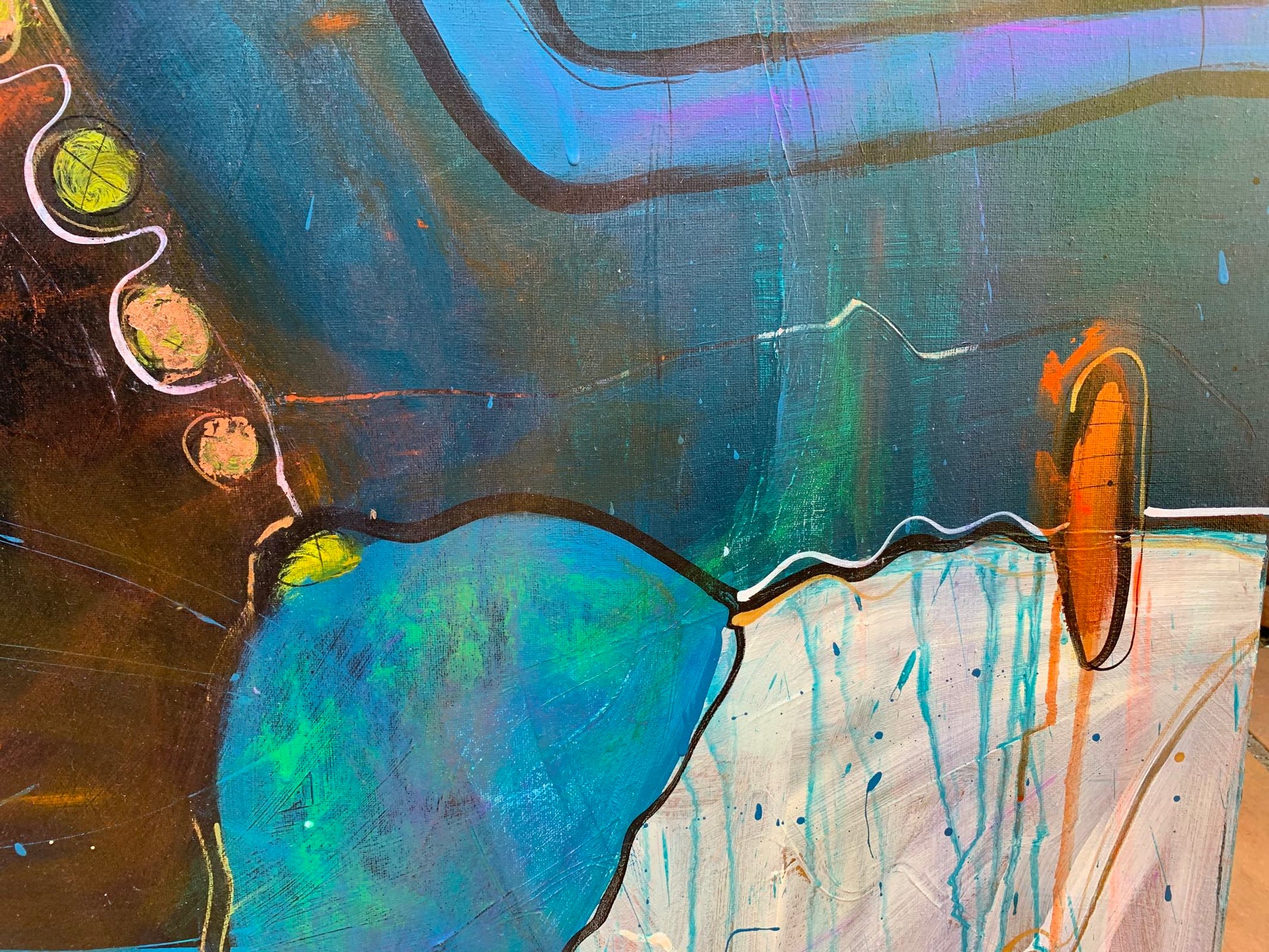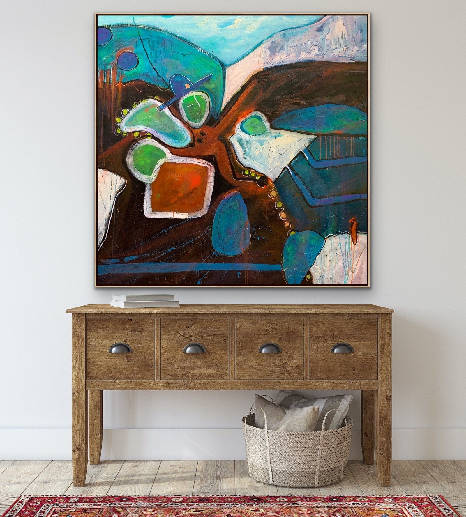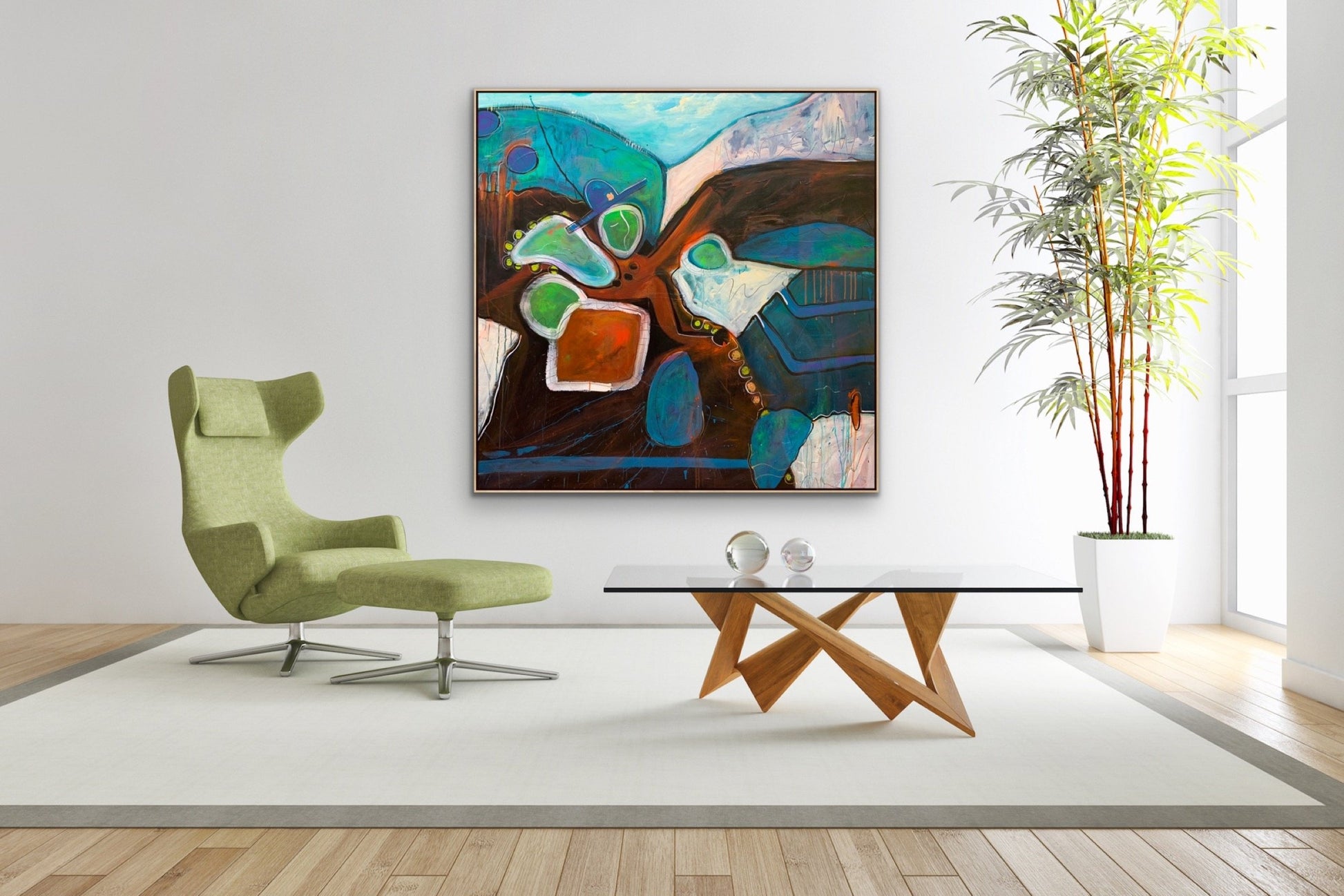 Lost Family is an original abstract by Tania Chanter inspired by the Australian landscape. Rich and vibrant in tones of orange, brown, black, white, and turquoise blue/green, with Copper foil highlights. Blackened edges, ready to hang. A Certificate of Authenticity is also provided.