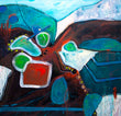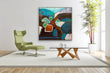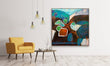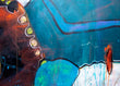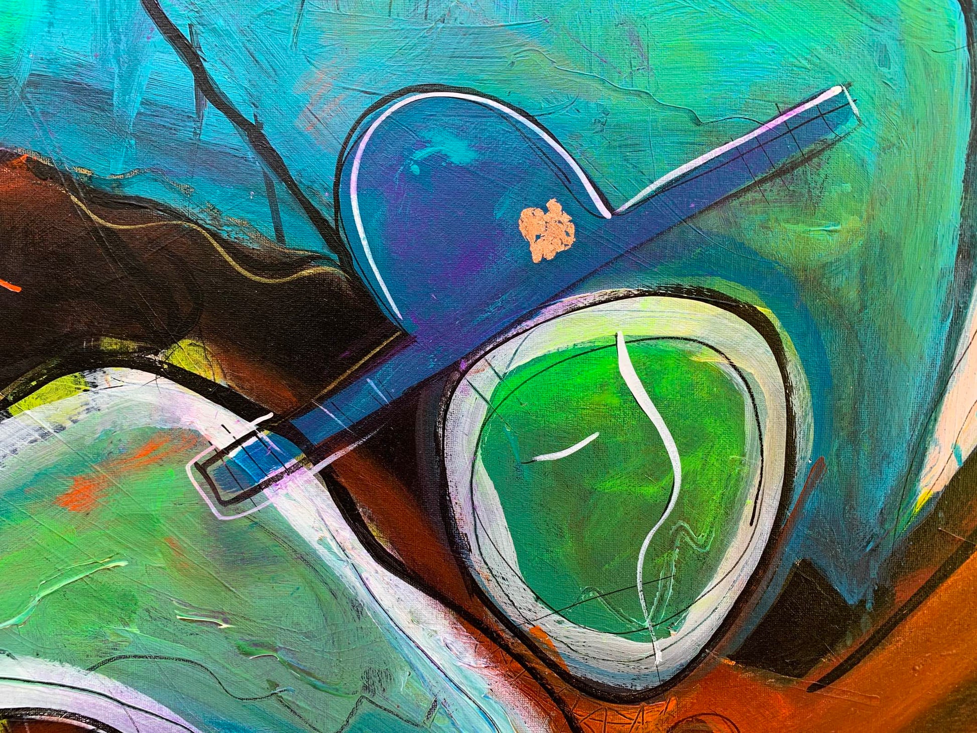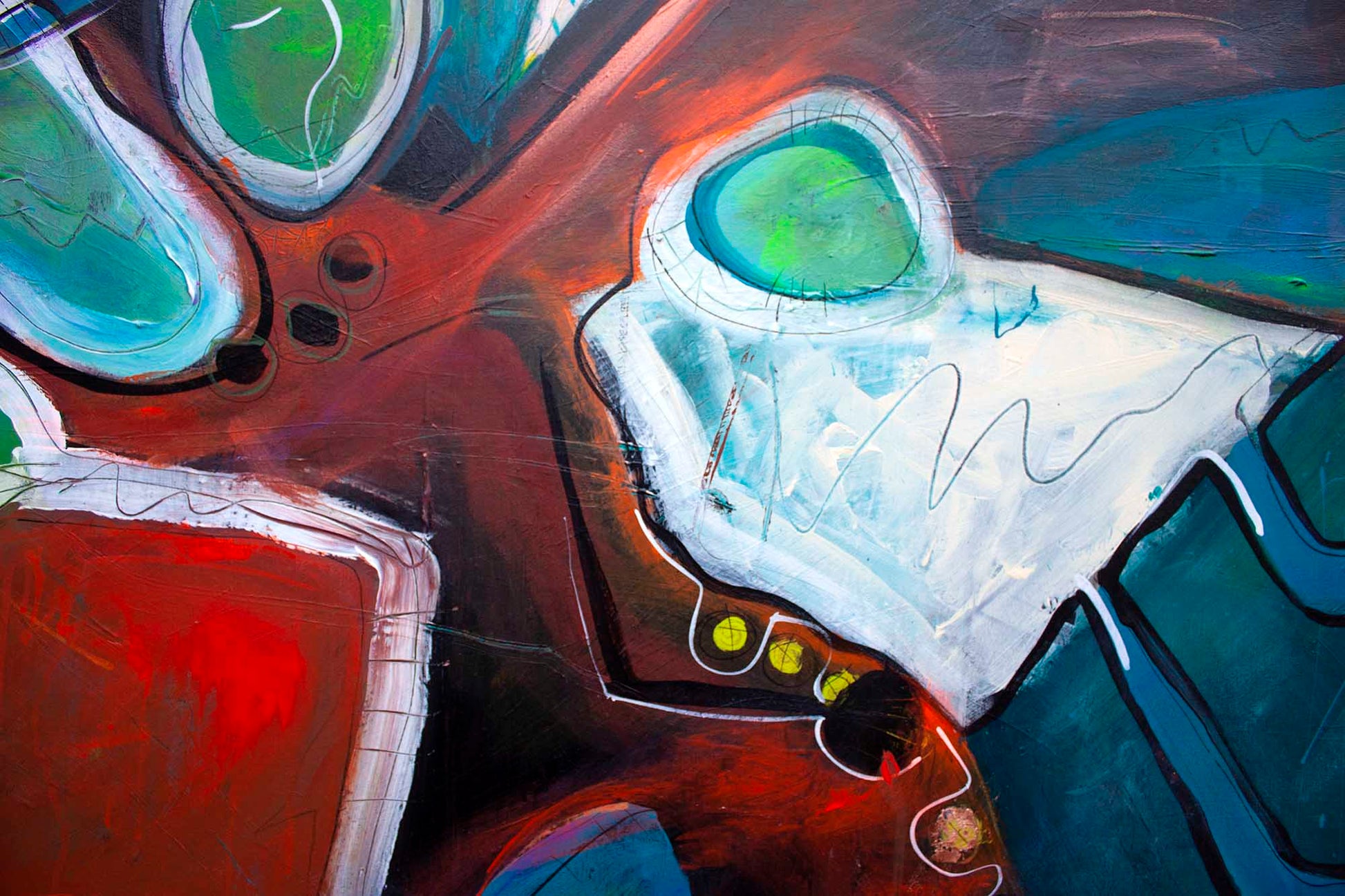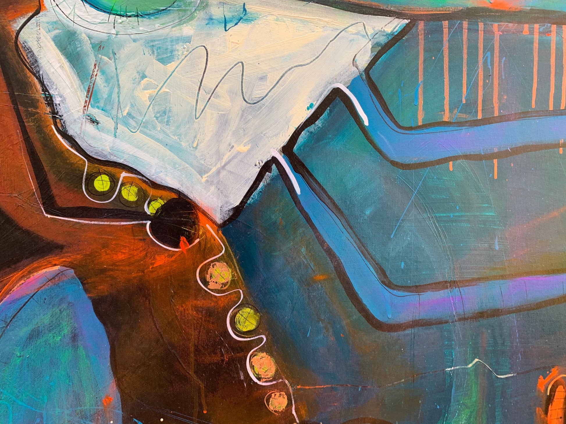 Lost Family is an original abstract by Tania Chanter inspired by the Australian landscape. Rich and vibrant in tones of orange, brown, black, white, and turquoise blue/green, with Copper foil highlights. Blackened edges, ready to hang. A Certificate of Authenticity is also provided.