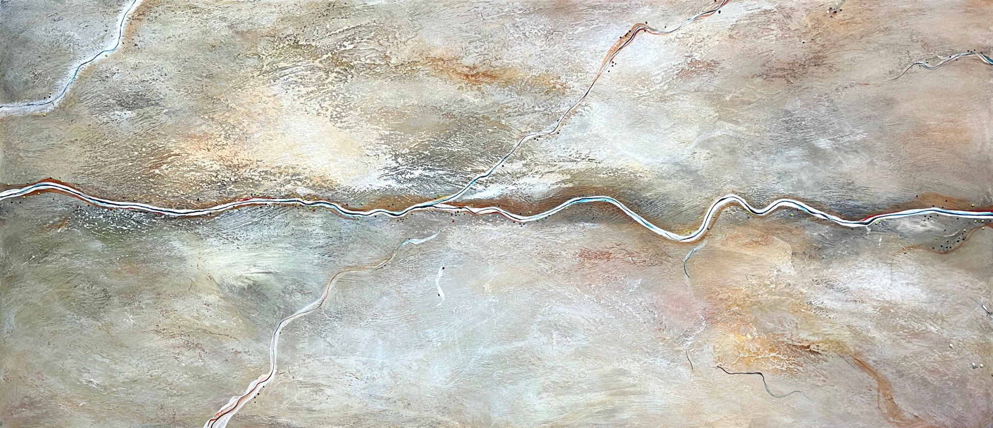 A textured aerial abstract landscape painted in soft, neutral tones. A narrow, winding river gently traverses the canvas from side to side, evoking the quiet persistence of time and nature. Subtle textures and layered hues whisper of long-forgotten paths and fleeting glimmers of light, capturing a moment suspended between memory and stillness.