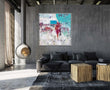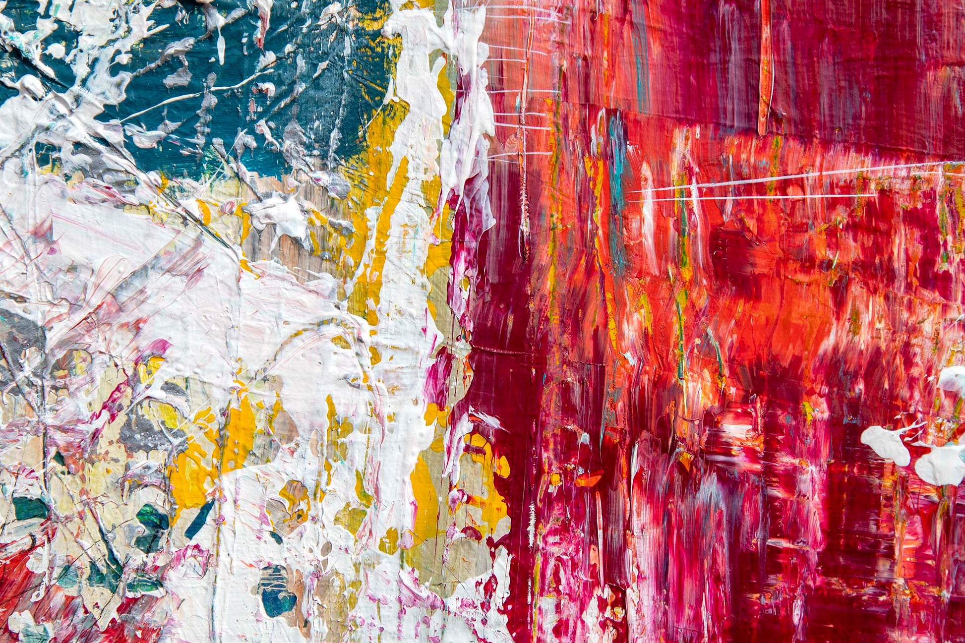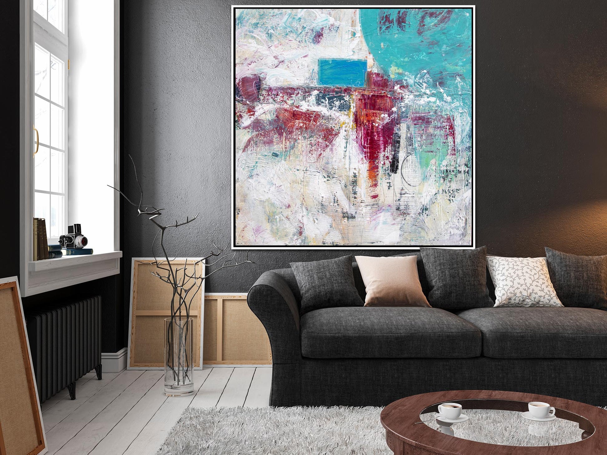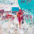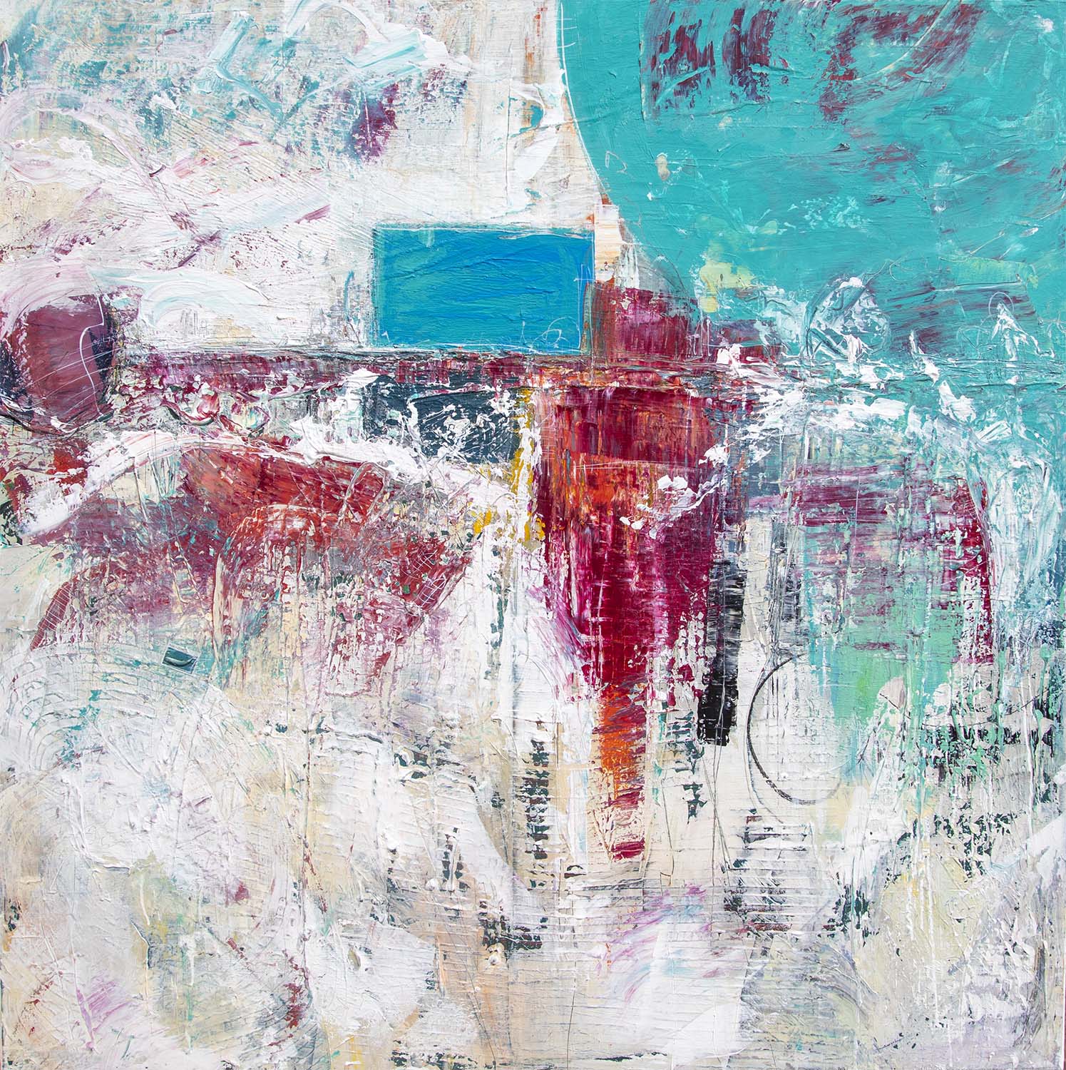 Sperm Whale is an original abstract landscape by Tania Chanter. Featuring lots of texture and small collage features in soft pastel tones of cream, white, grey/silver and pink, with a vivid horizon of rust red, teal blue and burgundy. This painting is finished with blackened edges and is ready to hang.