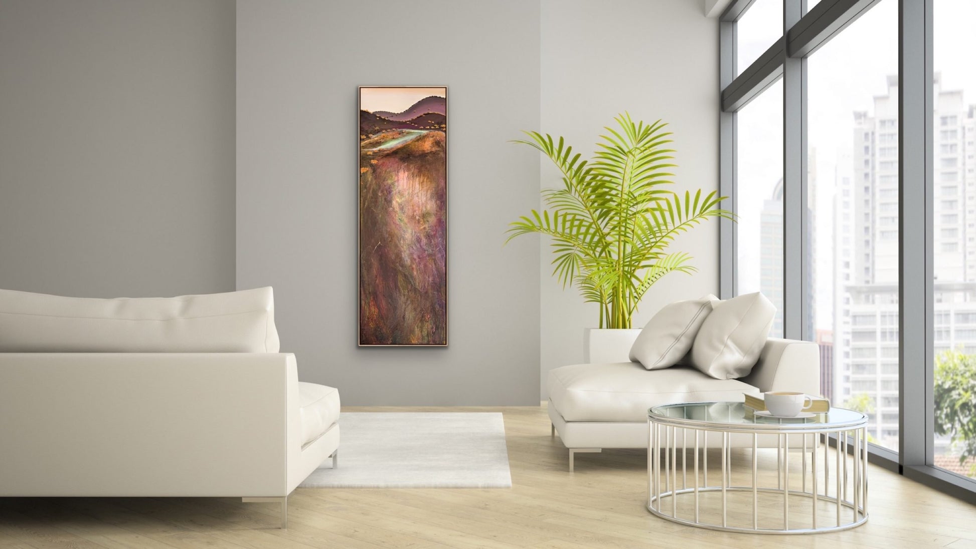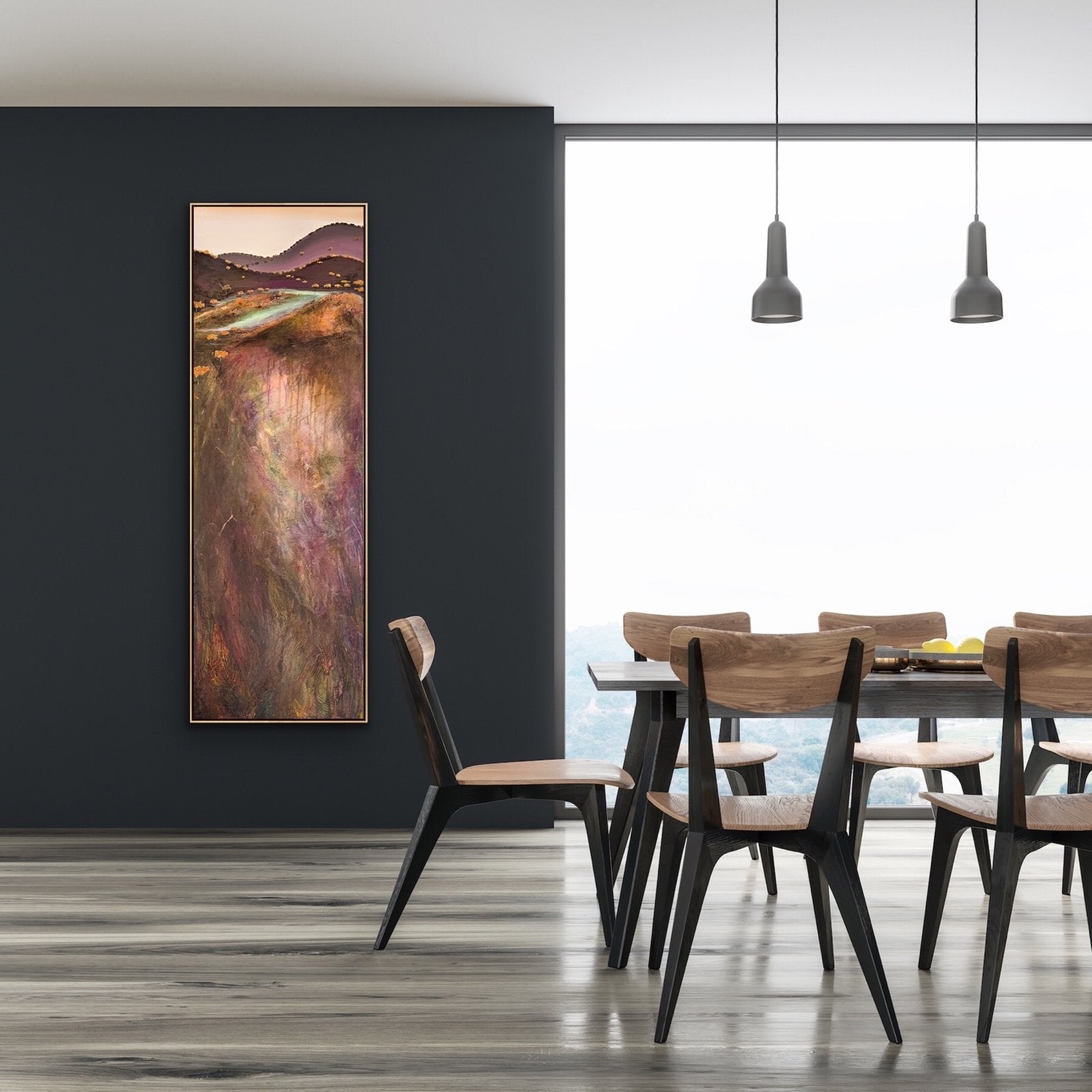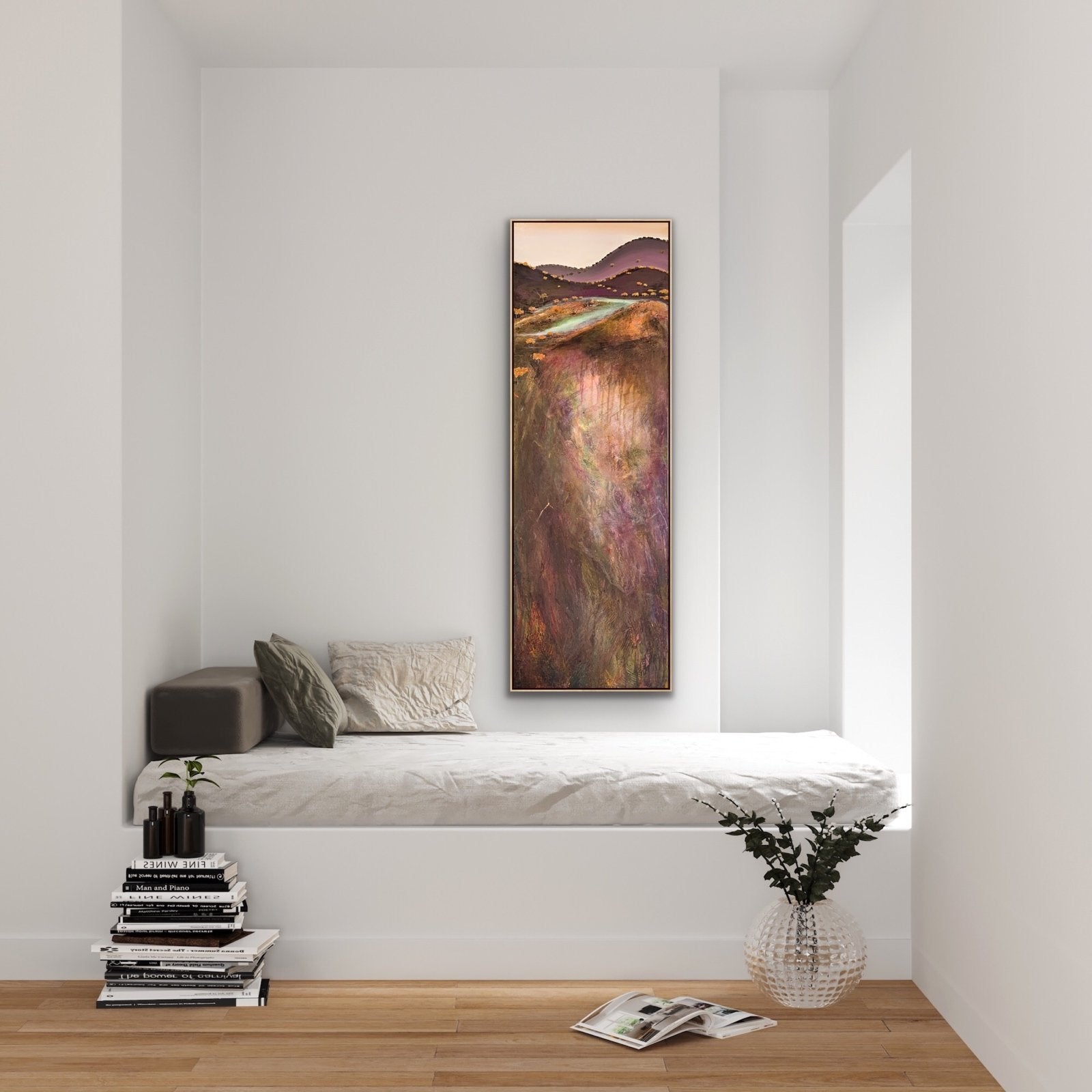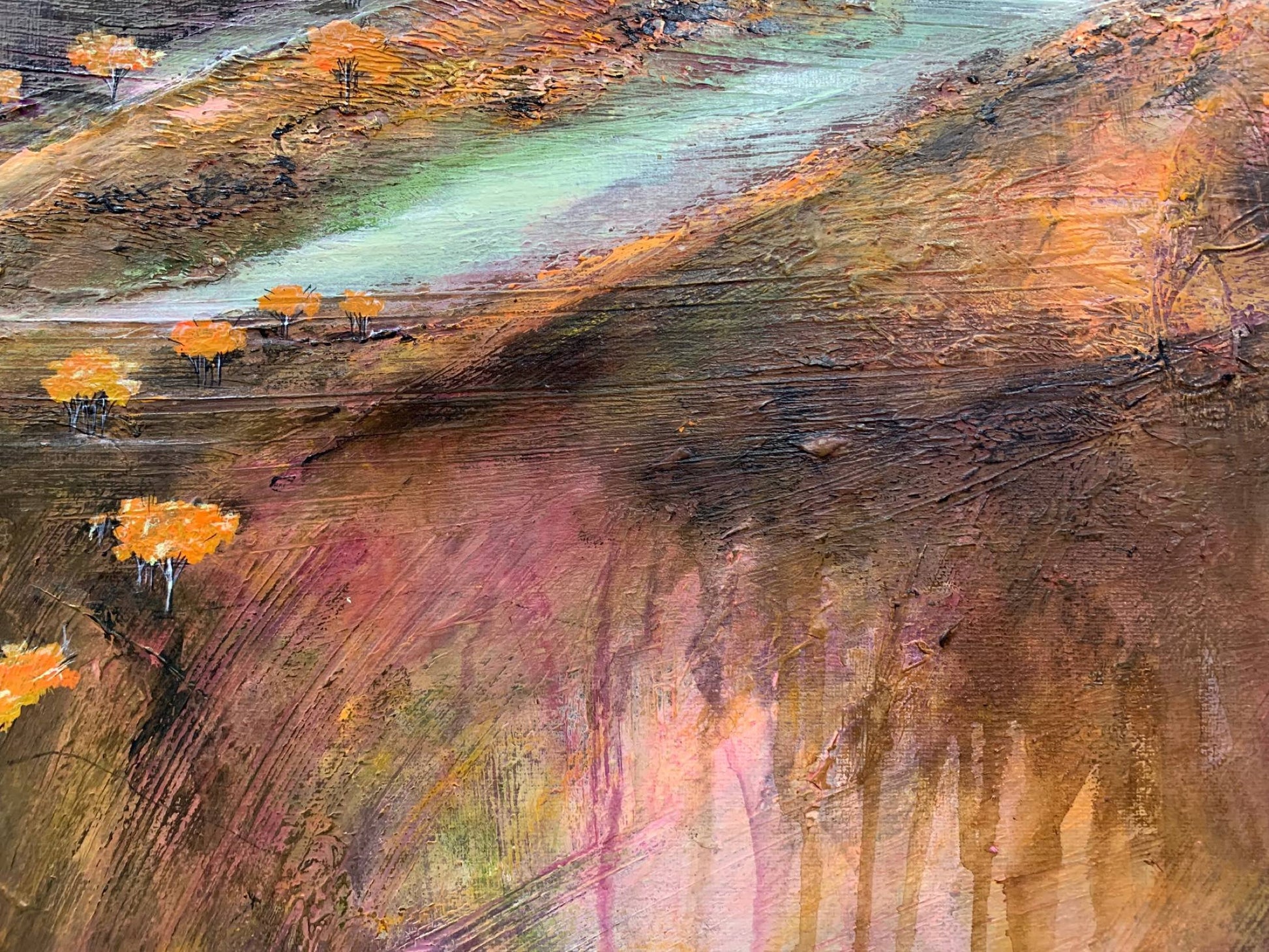 Spillers Gorge is an impressionist abstract landscape. With the warm glow of Autumn, the landscape comes to life, gathered like a colourful choir singing to Autumn's splendour. My hope is that this painting brings a sense of calm to the room where it lives, and that is makes the people who enter the room feel as though a part of nature is right there with them. Layered acrylics and inks on a texture base on stretched cotton canvas. This painting is double glazed and is framed in a light coloured timber to complement the piece and is ready to hang. The Artwork is stamped on the front, and signed and dated on the back, and will be securely packaged for your peace of mind. A Certificate of Authenticity is also provided.