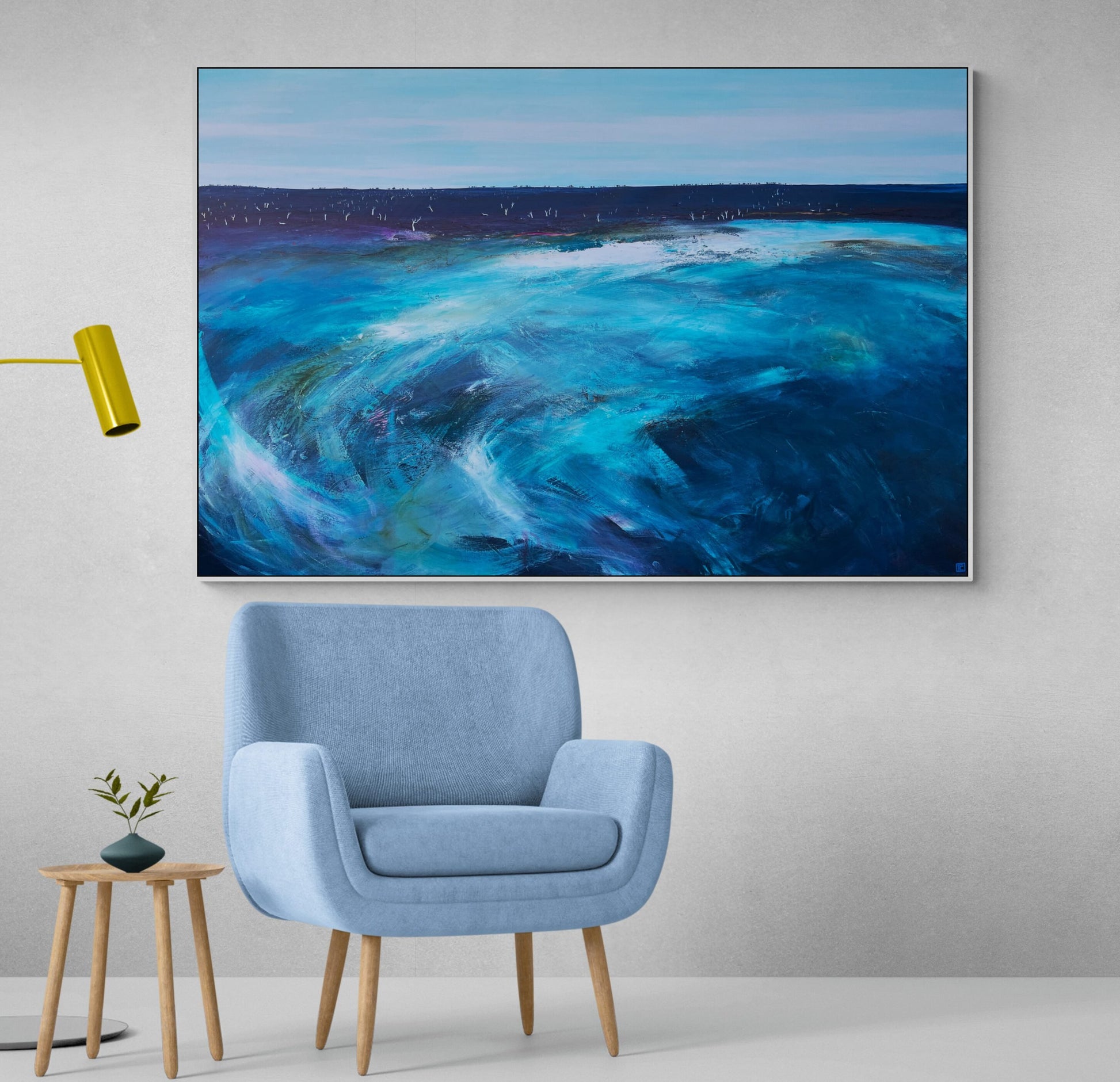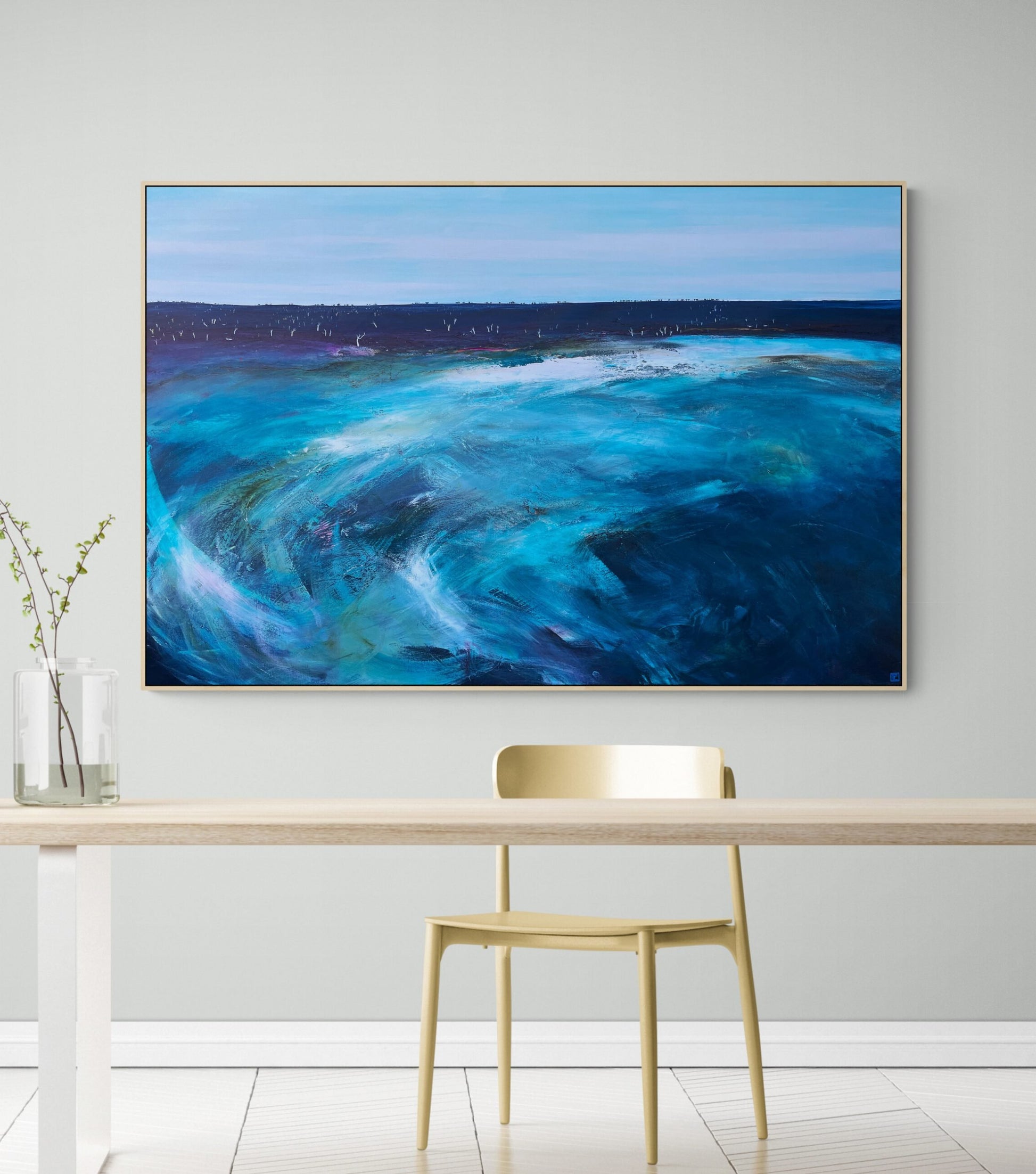 The Ever-Changing Land by Tania Chanter is inspired by the rich and vibrant tones of the Australian landscape and the changes of light and mood throughout the day. Tania’s hope is that this painting brings a sense of calm to the room where it lives, and that is makes the people who enter the room feel as though a part of nature is right there with them.