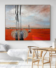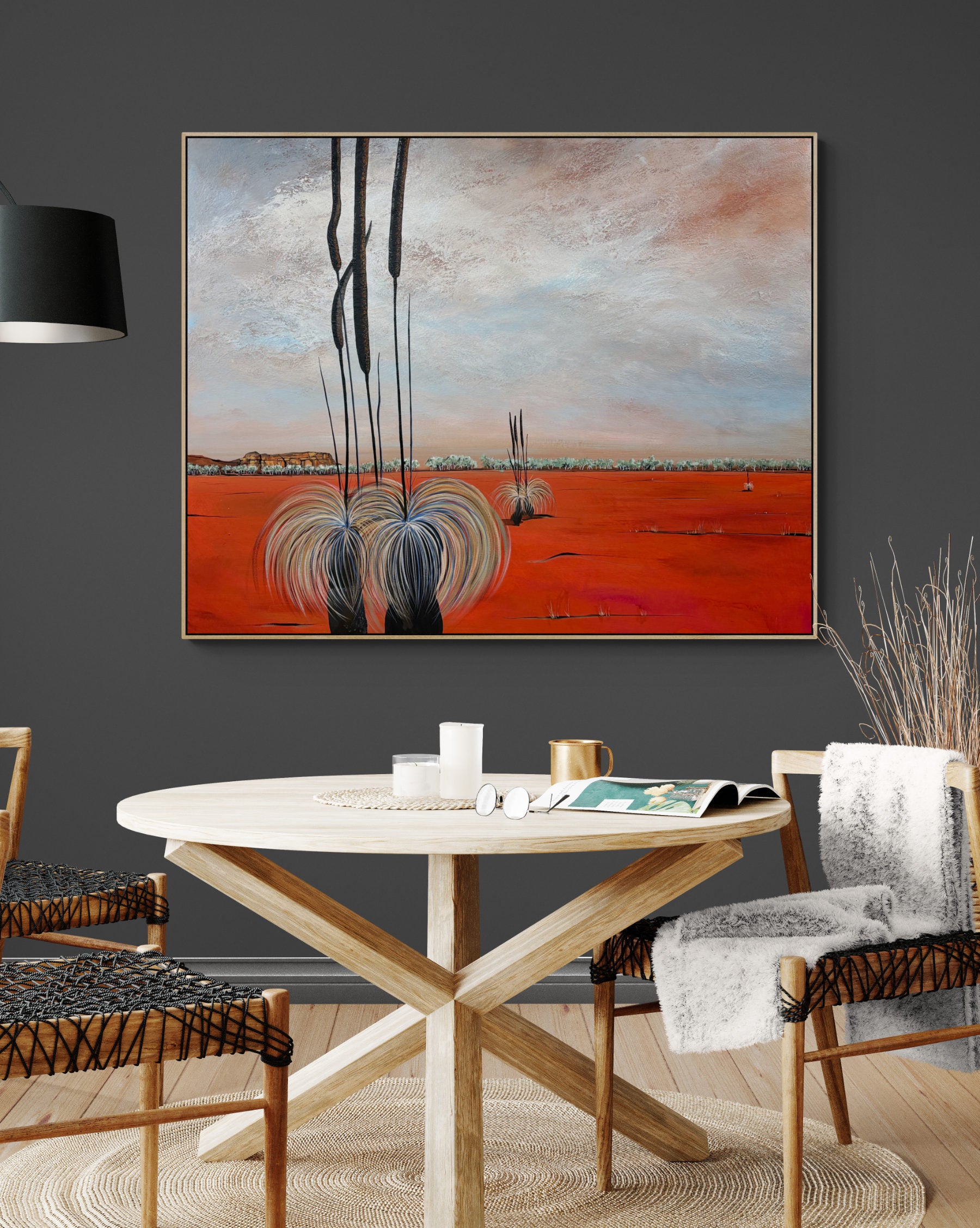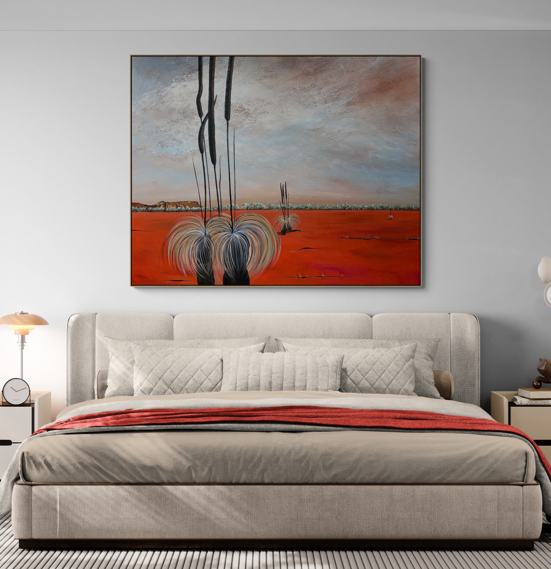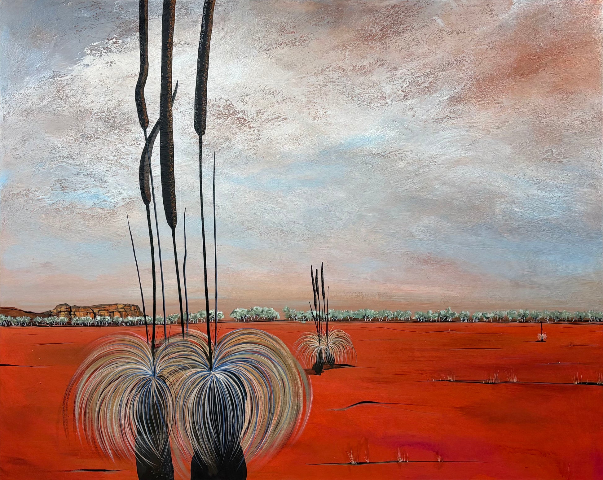 The Long Warm View invites you into the heart of the outback, where vivid orange and red tones stretch across the land, warmed by the endless sky. Native grass trees rise like quiet sentinels, scattered across the rugged landscape, while a distant mountain range anchors the horizon. Textured clouds drift overhead, catching the sun’s glow and adding depth to this immersive, timeless scene. It’s a view that lingers, stirring both memory and imagination, capturing the heat, stillness, and raw beauty of the land.
