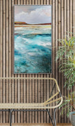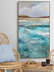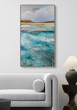 The Sea On Monday captures that slower, gentler mood when the coast feels unhurried and open. Layers of turquoise and sea-worn blues move across the surface, textured and shifting, while the distant land rests quietly beneath a wide, clouded sky. It’s a painting about pause, breath, and the quiet comfort of the sea when nothing is being asked of it.