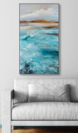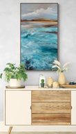 The Sea On Sunday captures that slower, gentler mood when the coast feels unhurried and open. Layers of turquoise and sea-worn blues move across the surface, textured and shifting, while the distant land rests quietly beneath a wide, clouded sky. It’s a painting about pause, breath, and the quiet comfort of the sea when nothing is being asked of it.