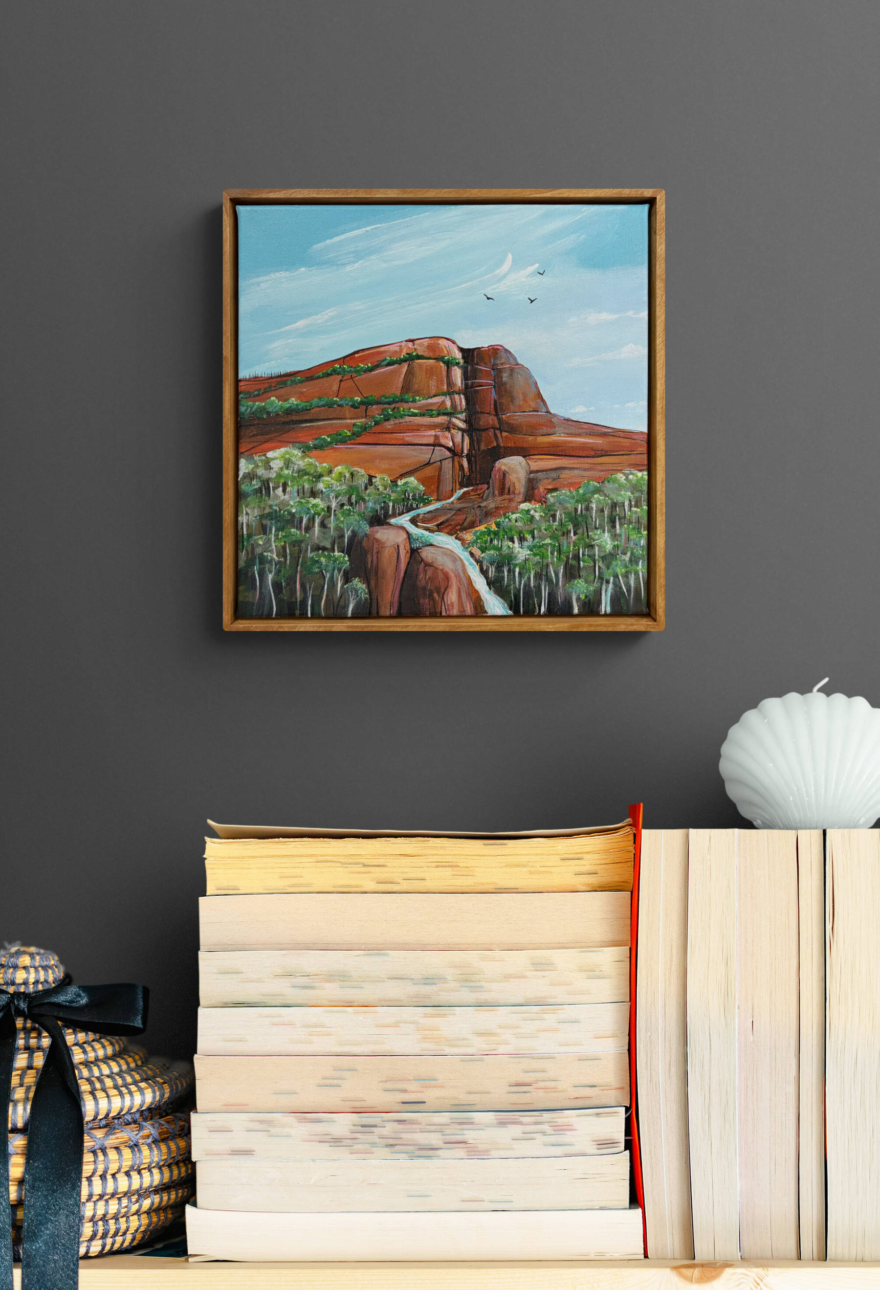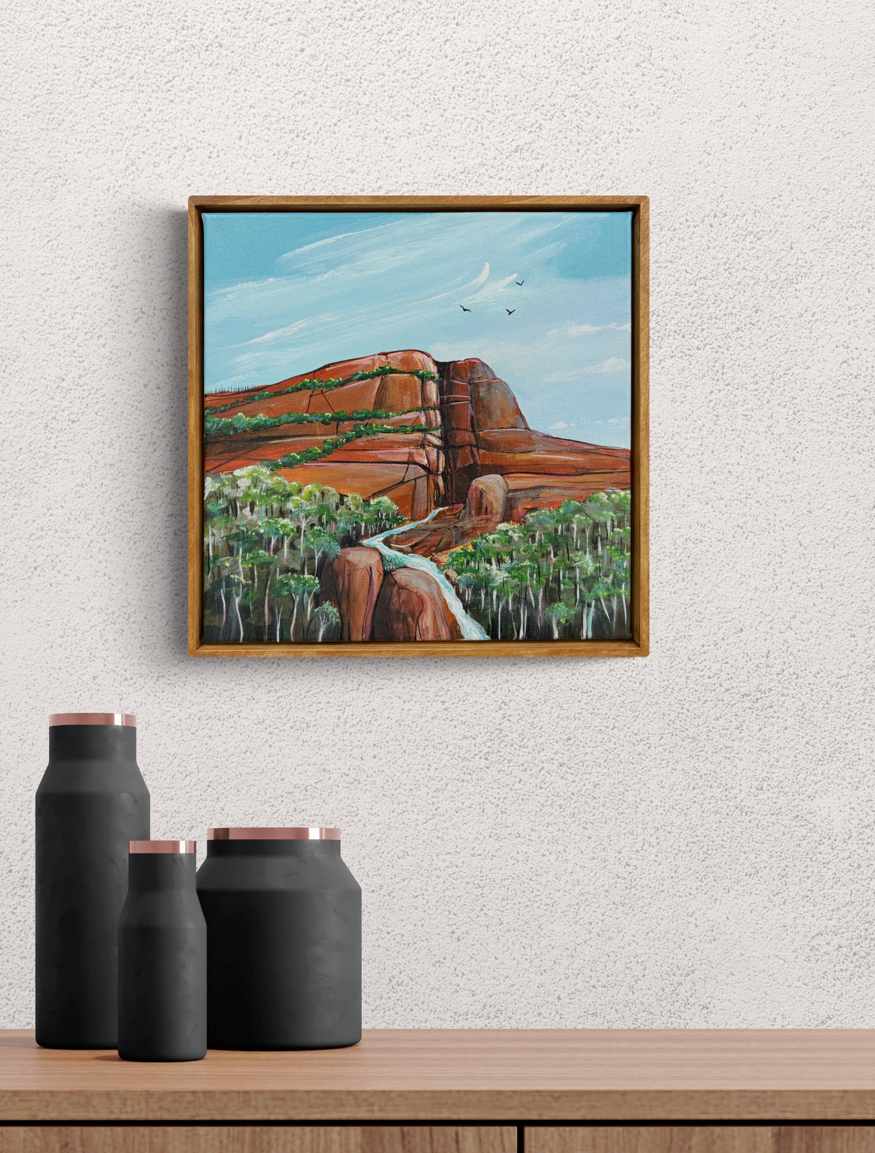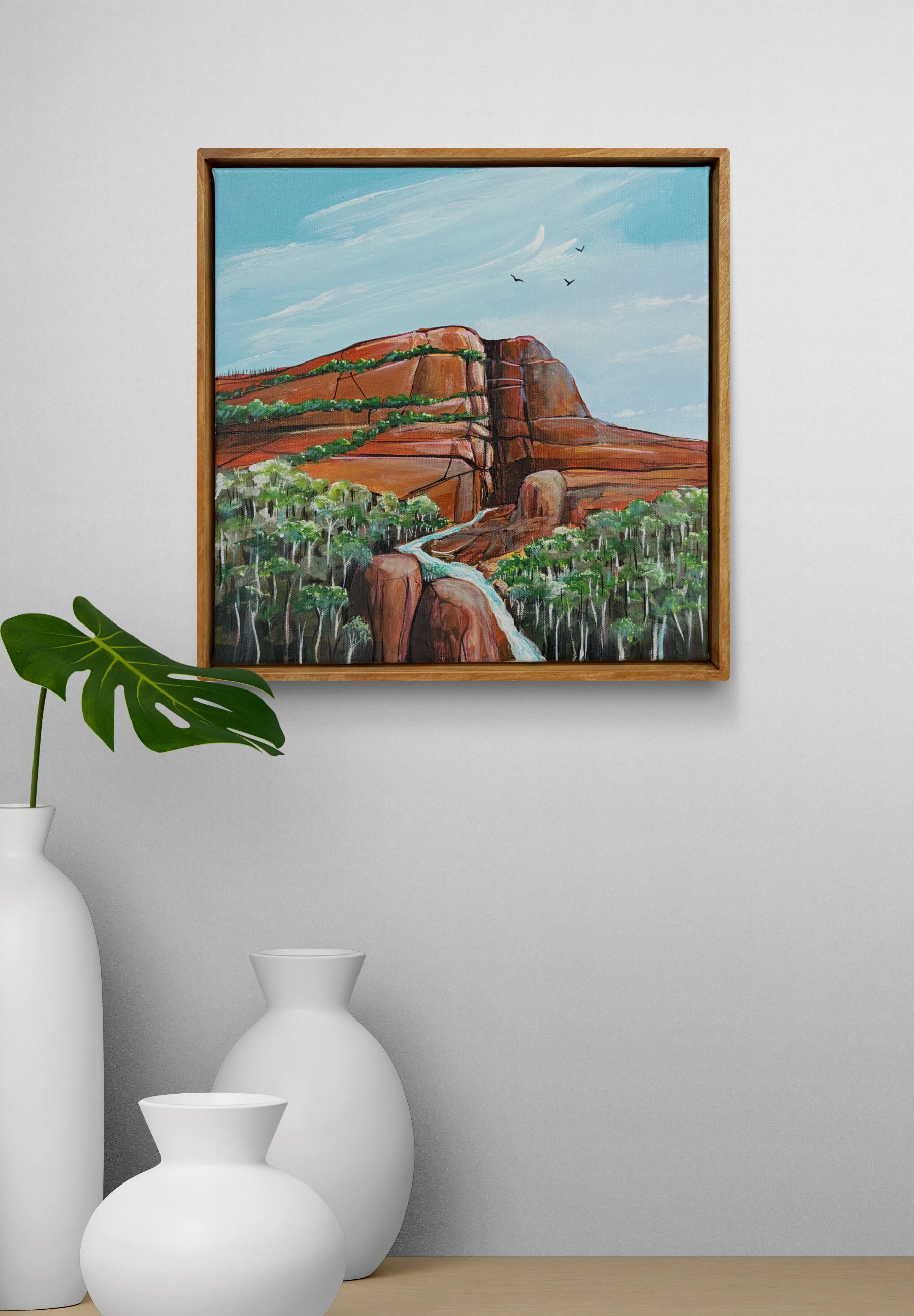- This painting is on stretched artist quality canvas, framed in natural timber and ready to hang.