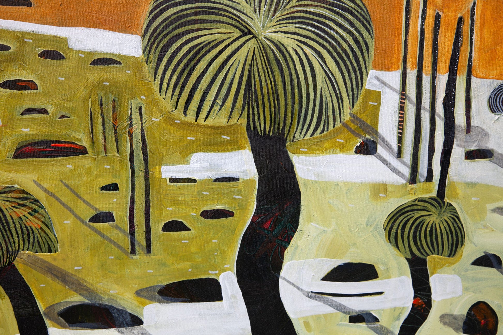 Through the use of strong lines, bold colours and overpainted textures Tania is endeavouring to capture the delicacy and strength of this vast country.
