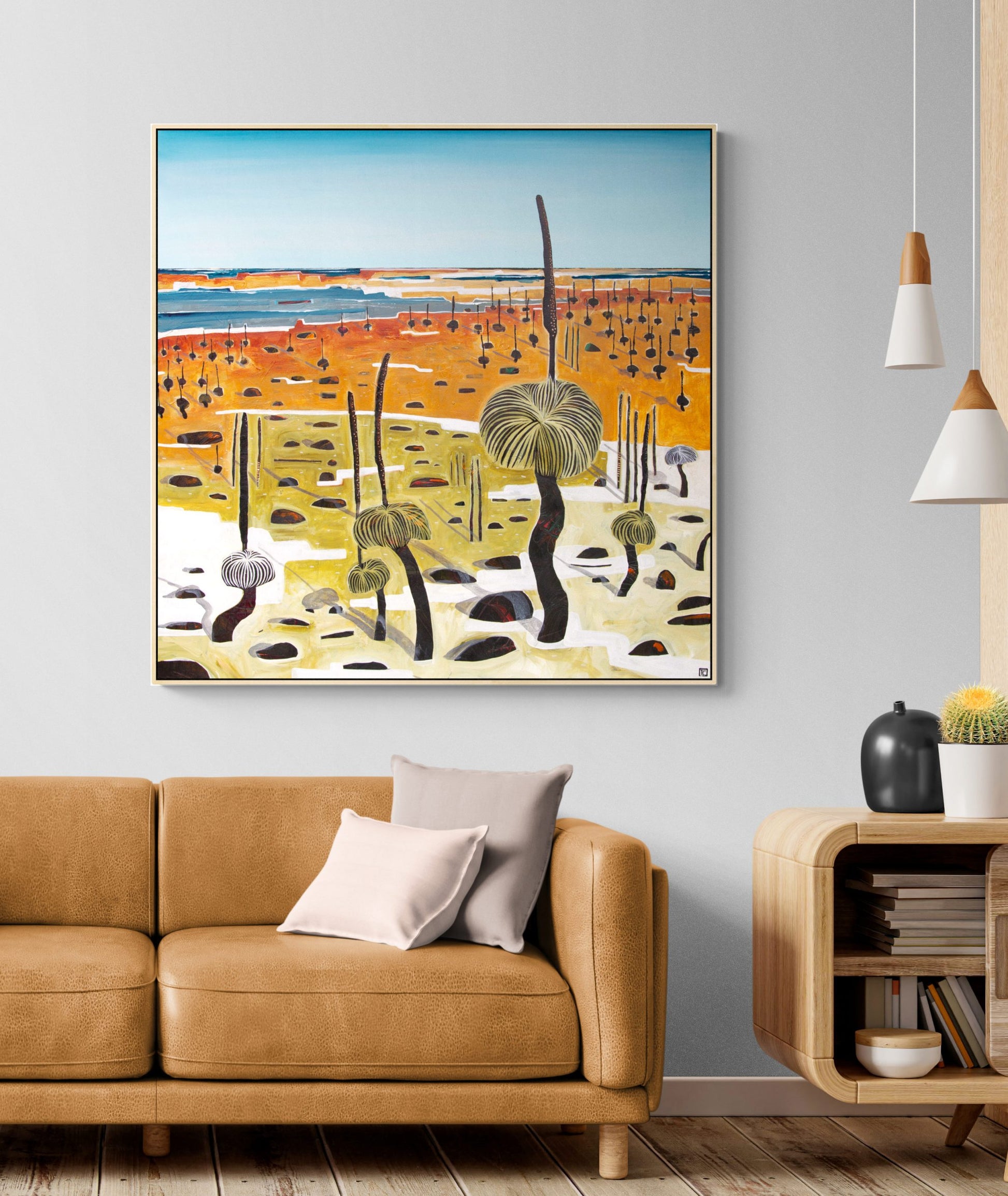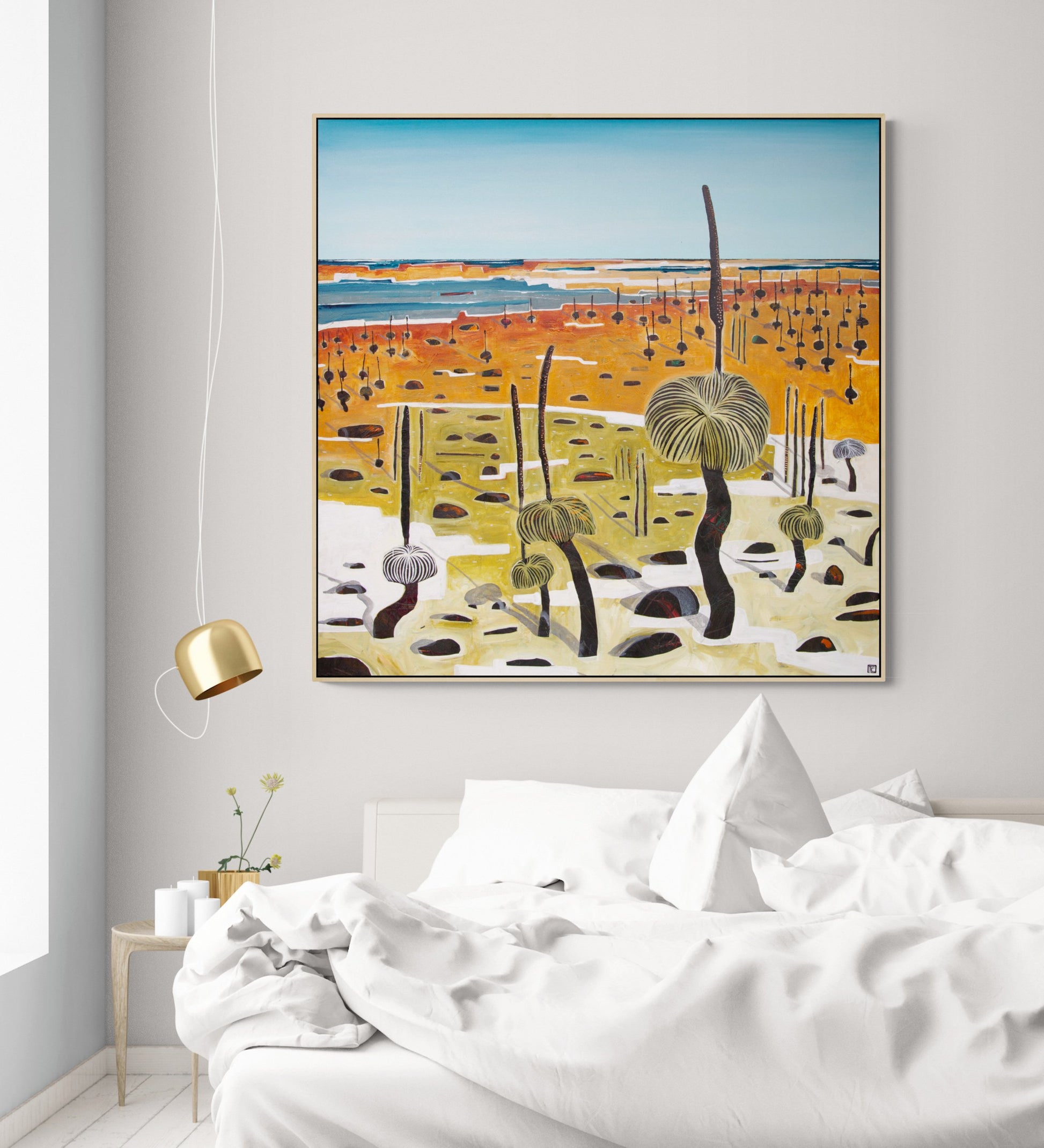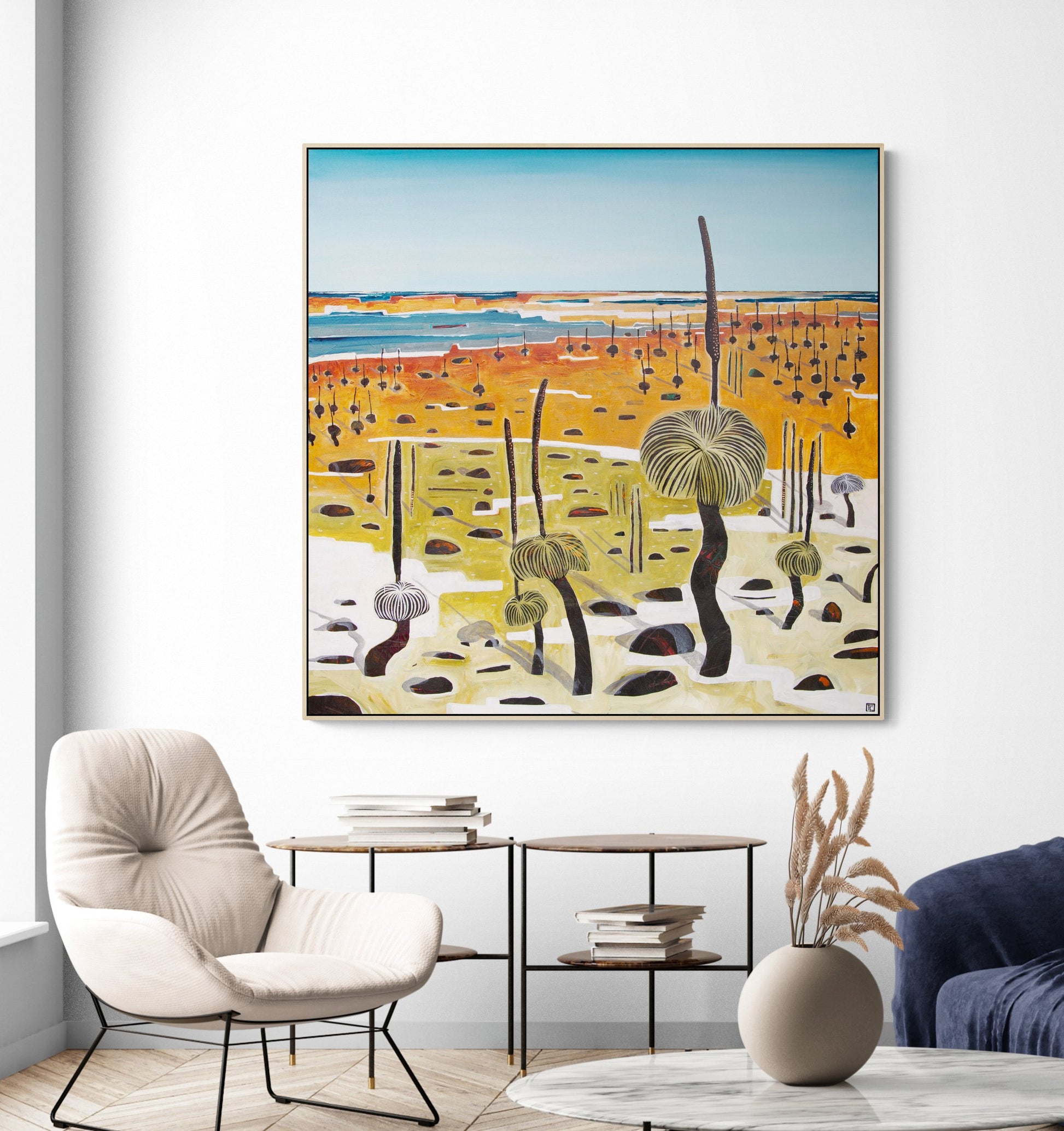 Tania is an Australian contemporary artist who has the desire to express emotion she feels from nature. Her feelings flow directly onto the canvas in an uninterrupted, intuitive flow; layers, textures and colours blend and evolve until some secret inner part feels satisfied. The depth and richness of the colours, the complexity of the sky – the romantic feeling of stormy clouds, the churning foam of the ocean on those days and the sunlight playing through tall grasses as they bend and wave. From the sweep of the vast landscape down to the bee among flowers, natures inspiration is endless.